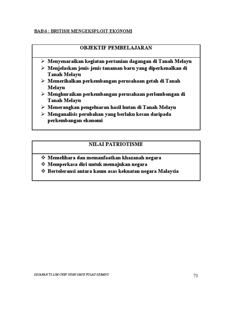 perjanjian peraturan b a b perkembangan ekonomi perkembangan hasil dagangan kemajuan ekonomi 6 bijih timah lumpur majukan dgn kemajuan menggunakan kapal korek bidang pendidikan dan pelabur asing • pendidikan • kesan melayu, inggeris, cina.